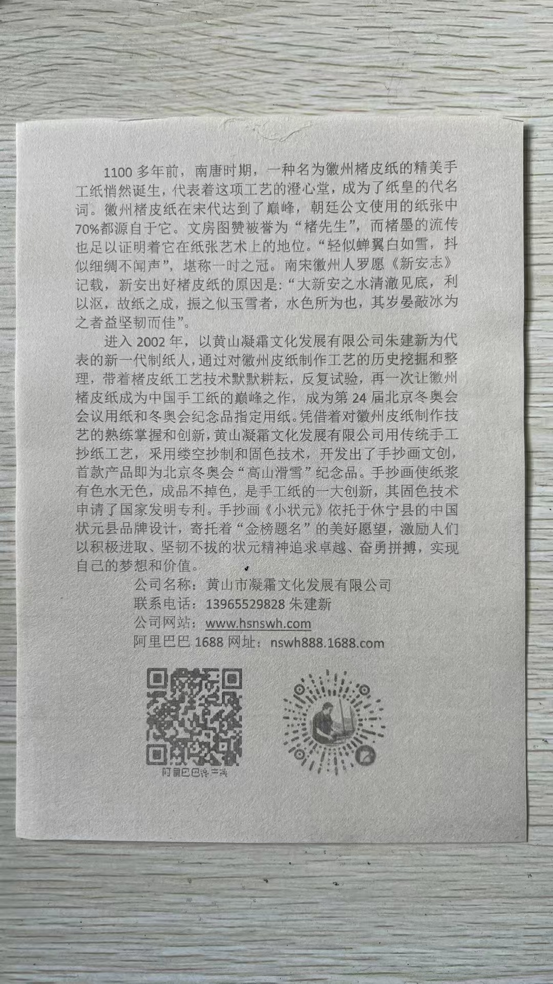 2020年公司實(shí)現(xiàn)了文化類規(guī)上企業(yè),迄今已申請(qǐng)了15項(xiàng)發(fā)明專利,19項(xiàng)實(shí)用新型專利,其中已授權(quán)發(fā)明專利3項(xiàng),實(shí)用新型專利11項(xiàng);2022年,公司為北京第24屆冬季奧運(yùn)會(huì)提供楮皮紙和紀(jì)念品,非遺傳承人朱建新被授予北京2022年冬季奧會(huì)參與證書,以感謝第24屆冬奧會(huì)取得圓滿成功做出的貢獻(xiàn)。2022年-2024年,朱建新被中國科技大學(xué)聘為《中國筆墨紙硯》全校公選課特聘導(dǎo)師;2023年,朱建新獲省級(jí)非遺傳承人稱號(hào)、“黃山工匠”稱號(hào)。